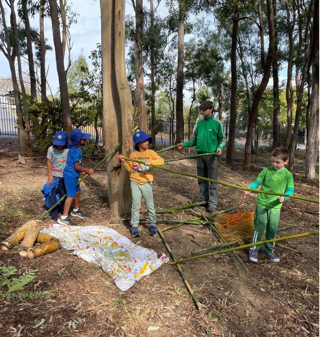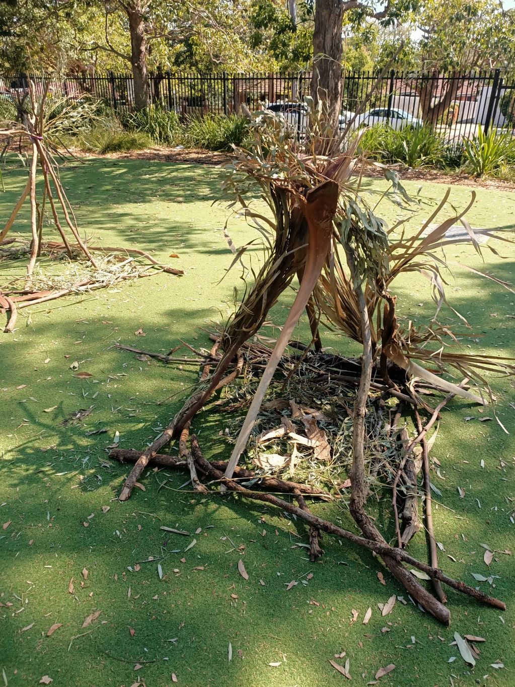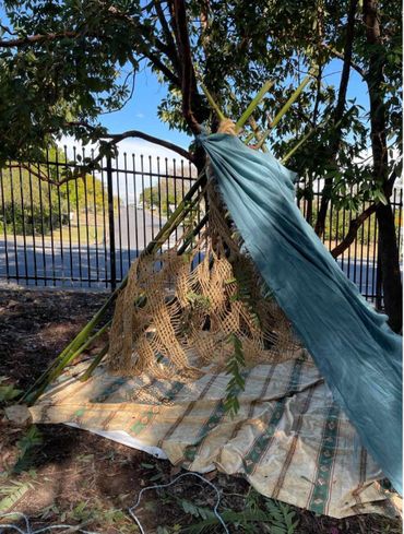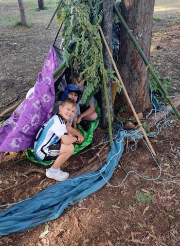 Kids will then work in groups of 2-5 to build their shelter using a mixture of natural and recycled materials. This includes sticks, branches and foliage found on the ground, as well as rope, canvas material and other repurposed / found objects (supplied by facilitator).